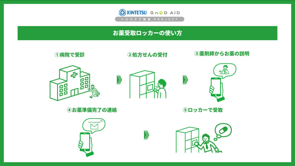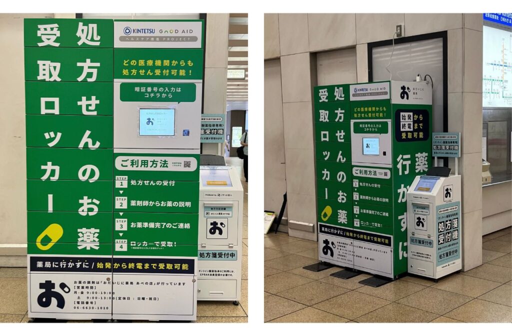 お薬受取ロッカー設置は、大阪阿部野橋駅 西改札口にて処方せんの受付・受取が完了する近畿日本鉄道株式会社とGOOD AID株式会社が共同で行うヘルスケアプロジェクトです。